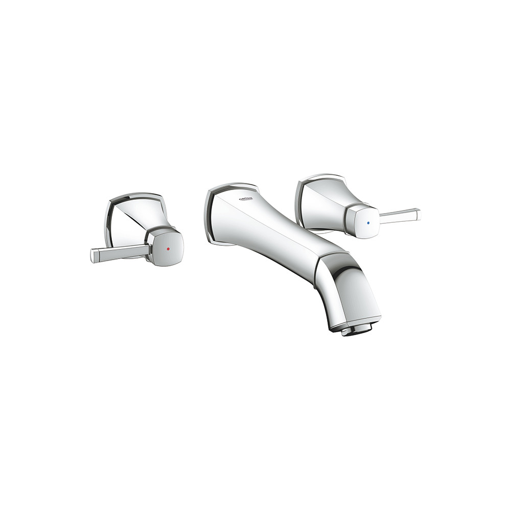 The Grandera 3-hole basin Mixer by Grohe in chrome will complete your bathroom with its simple design, a glossy finished chrome material.