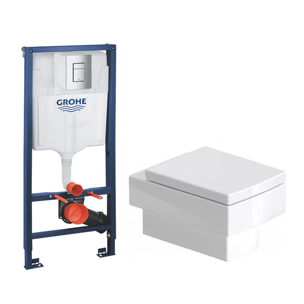 مرحاض معلق فيرو أبيض ديورافيت مع خزان دفن بشاسية كامل ولوحة طرد مربعة كروم جروهى